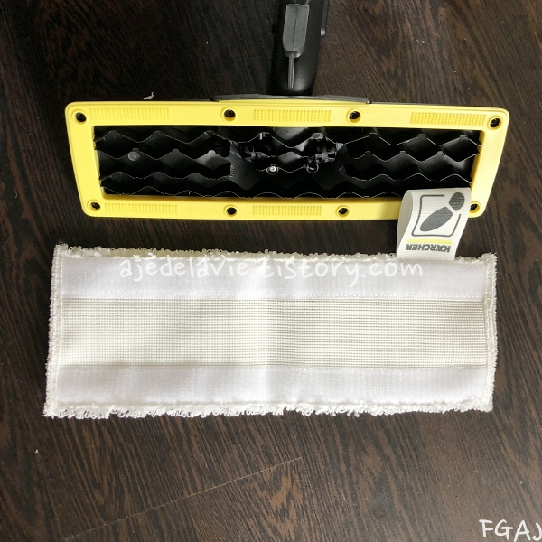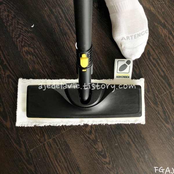 5. 바닥 노즐과 함께 극세사 걸레가 같이 제공이 되고 쉽게 탈부착이 가능합니다. 청소 후에는 세탁 후 말렸다가 다음에 쓸 때 다시 부착해서 사용합니다. 청소 도중 말려들거나 떨어지지 않게끔 단단하게 잡고 있고, 떼어 낼 때는 발 모양의 태그를 밟고 분리하면 쉽게 분리가 됩니다.